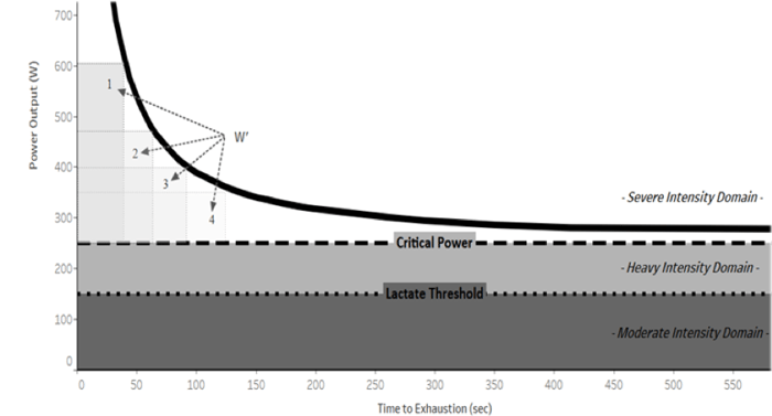 W’ (called double-u prime) is a mathematical model-based constant (measured in kilojoules) with physiological interpretations. Physiologically it represents a fixed amount of work that can be performed in intensities above the second threshold (in other words, above critical power / at the severe intensity domain). Mathematically speaking, W’ is the curvature constant or of the hyperbolic intensity- duration plot. In other words, at the curvilinear part of the graph in Figure 1(1,2,3,4) W’ is the area under the curve for each of these points and they are equal to each other.