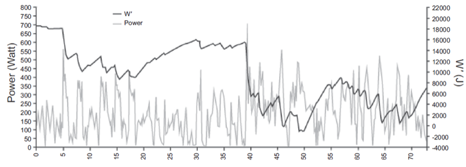 Figure 3 is an illustration of how W’bal looks like while exercising in different intensities. The left axis and the light gray graph represent power (or intensity), the right axis and the dark gray graph represent W’bal at any given time, and the X axis represents time.