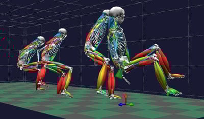 Figure 3 shows examples of a subject during ingression (Figure 3A), while seated (Figure 3B) and during egression (Figure 3C). The muscle activity is indicated by the color of the muscle; a blue muscle has little activity whereas the activity of a red muscle is high.